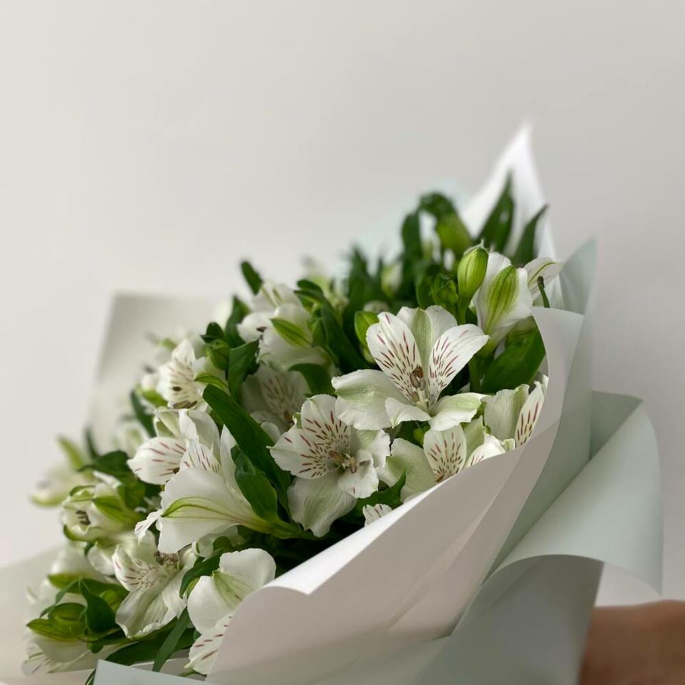 Лента – 1 шт.Альстромерия белая – 9 шт.бумага дизайнерская – 1 шт.