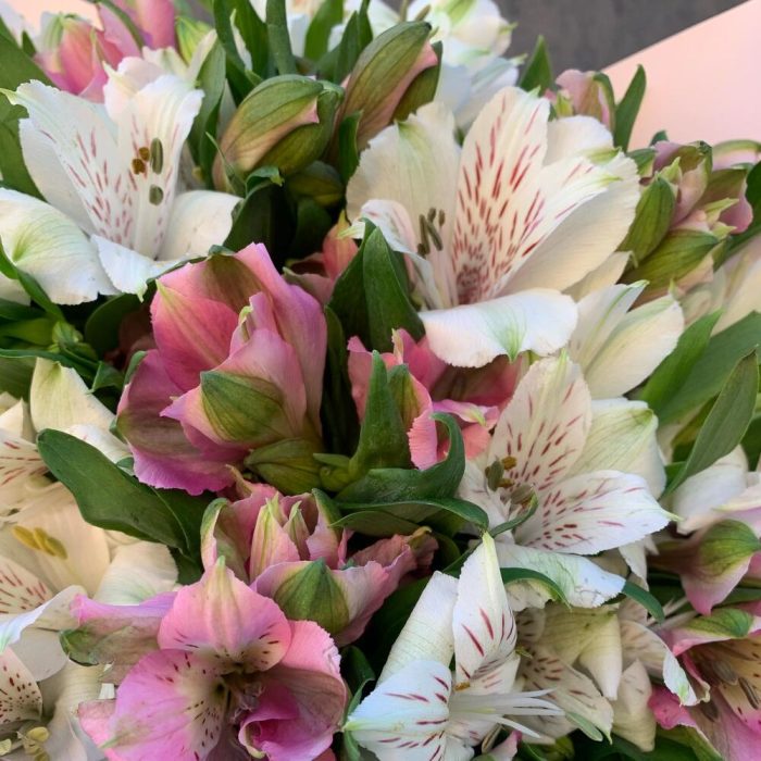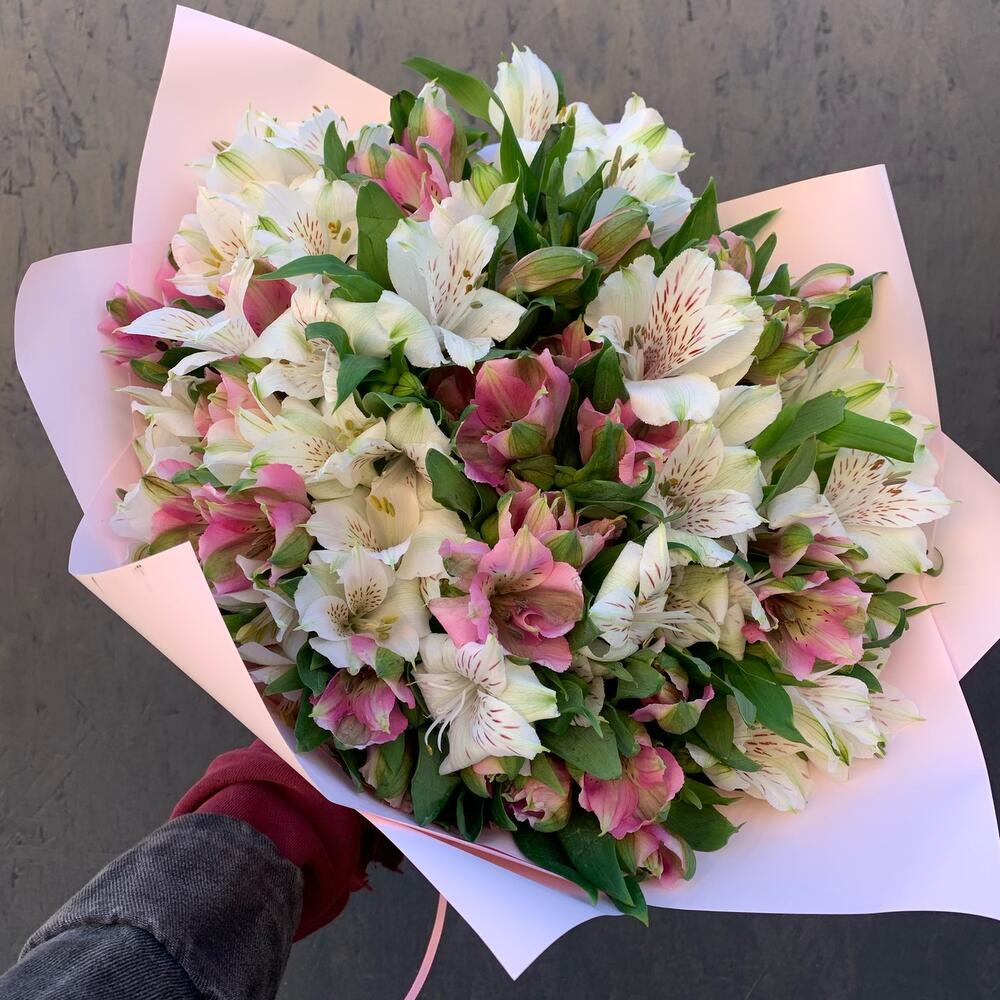Букет из 25 розовых и белых альстромерий в стильной упаковке