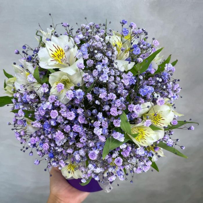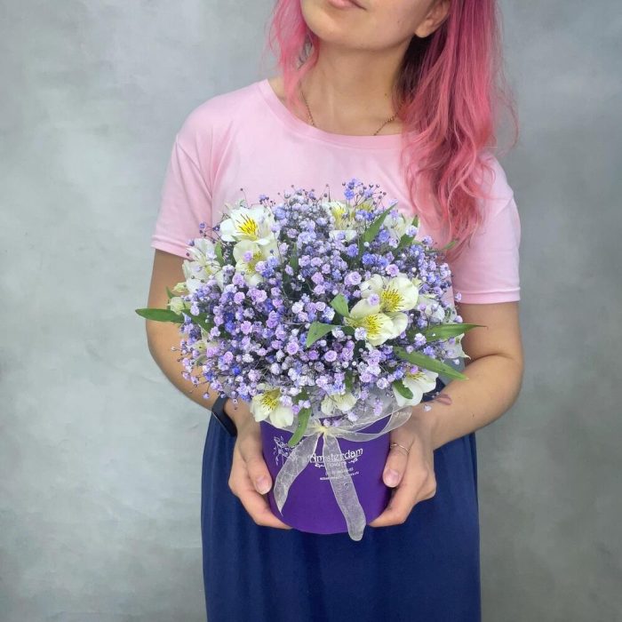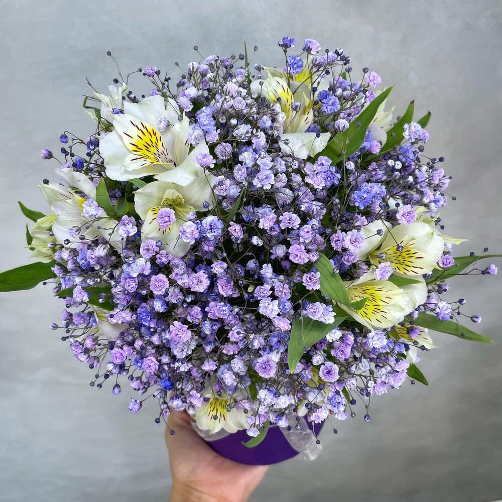 Коробка d12 – 1 шт.Оазис – 1 шт.Альстромерия – 7 шт.Гипсофила – 4 шт.