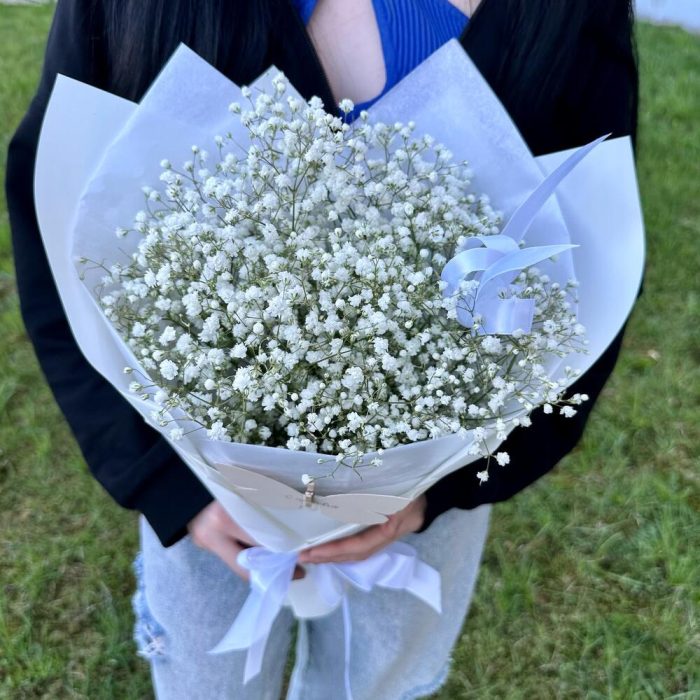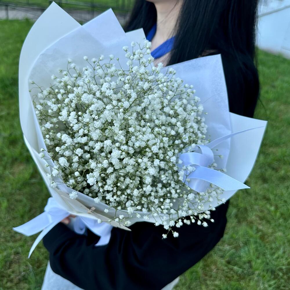 Гипсофила – 7 шт.Лента атласная – 1 шт.Пленка матовая – 1 шт.Открыточка с вашими пожеланиями – 1 шт.
