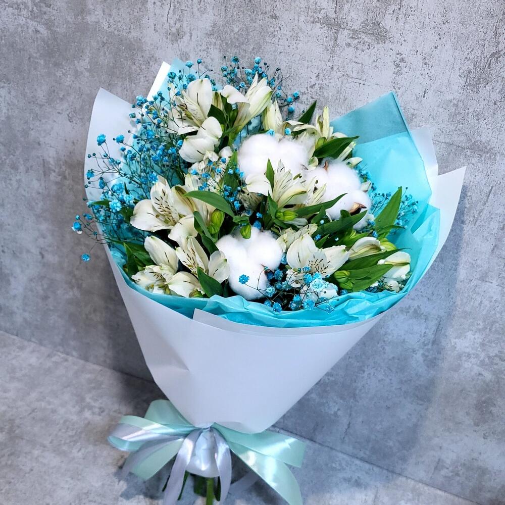 Альстромерия – 5 шт.Гипсофила – 1 шт.Хлопок – 3 шт.Лента атласная – 1 шт.Упаковка дизайнерская – 1 шт.