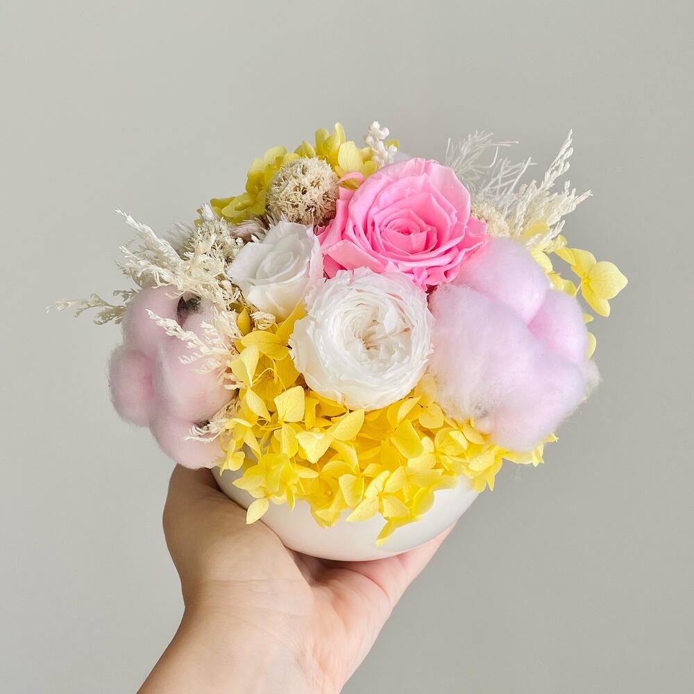 Гортензия – 3 шт.Хлопок – 3 шт.лимониум стабилизированный – 8 шт.розы стабилизированные – 3 шт.