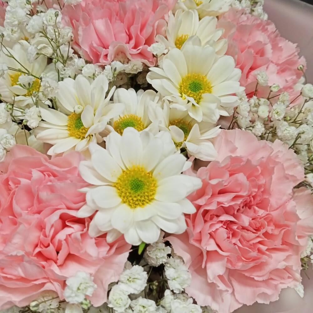 Сантини – 5 шт.Гипсофила – 2 шт.Гвоздика – 7 шт.Упаковка дизайнерская – 1 шт.