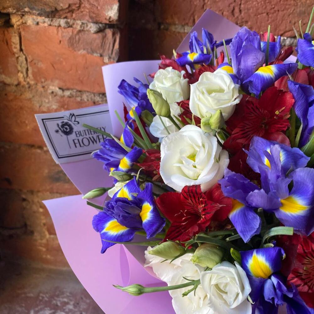 Букет из альстромерии, эустомы и ирисов в стильной упаковке “Ситцевый платочек”