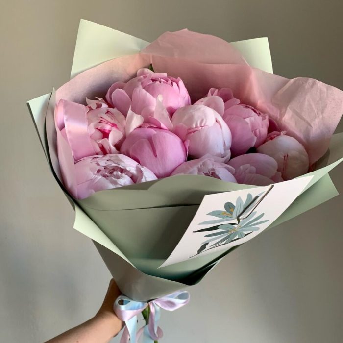 Лента атласная – 4 шт.Пион Сара Бернар – 9 шт.Упаковка дизайнерская – 4 шт.Средство для продления жизни цветов – 2 шт.инструкция по уходу за цветами – 1 шт.
