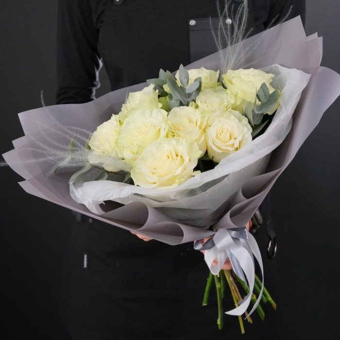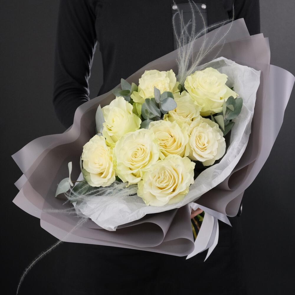 9 белых роз Мондиаль с эвкалиптом