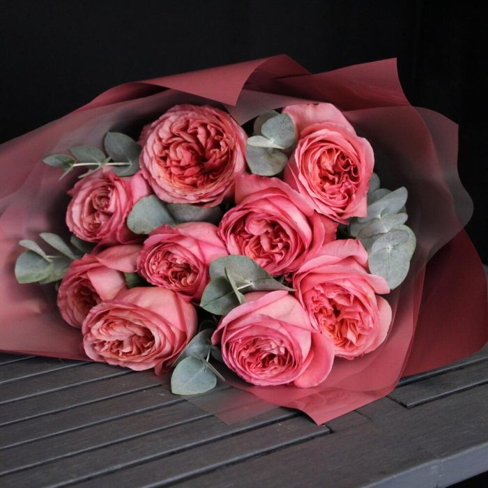 9 пионовидных роз сильва Пинк с эвкалиптом