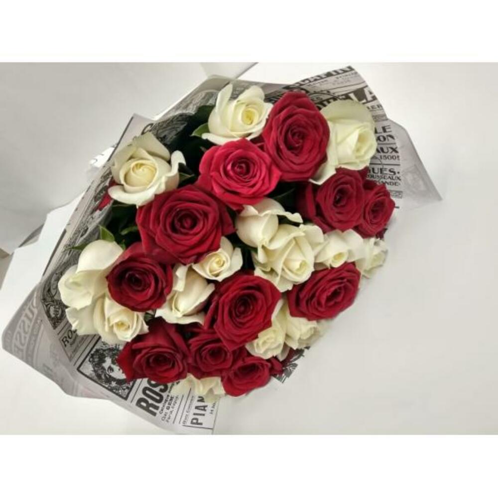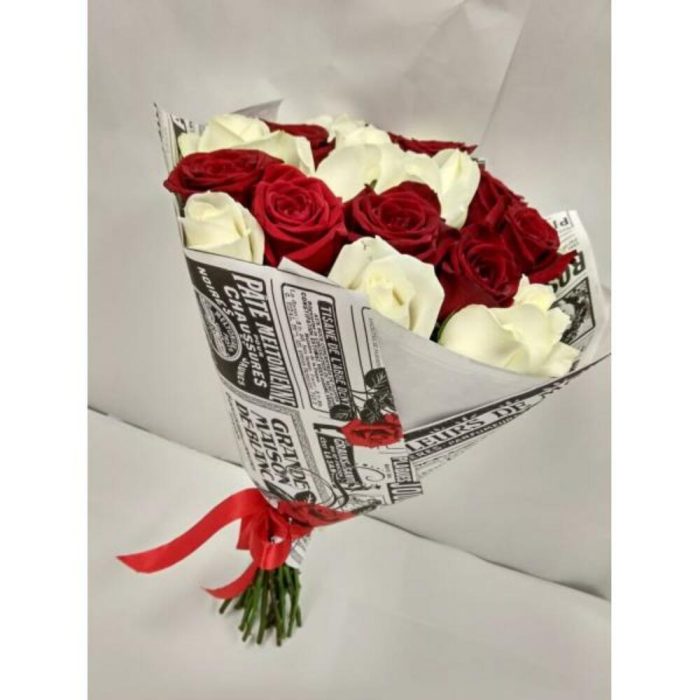 роза красного цвета 60 см – 15 шт.роза белая аваланш 60 см – 10 шт.Упаковка – 1 шт.