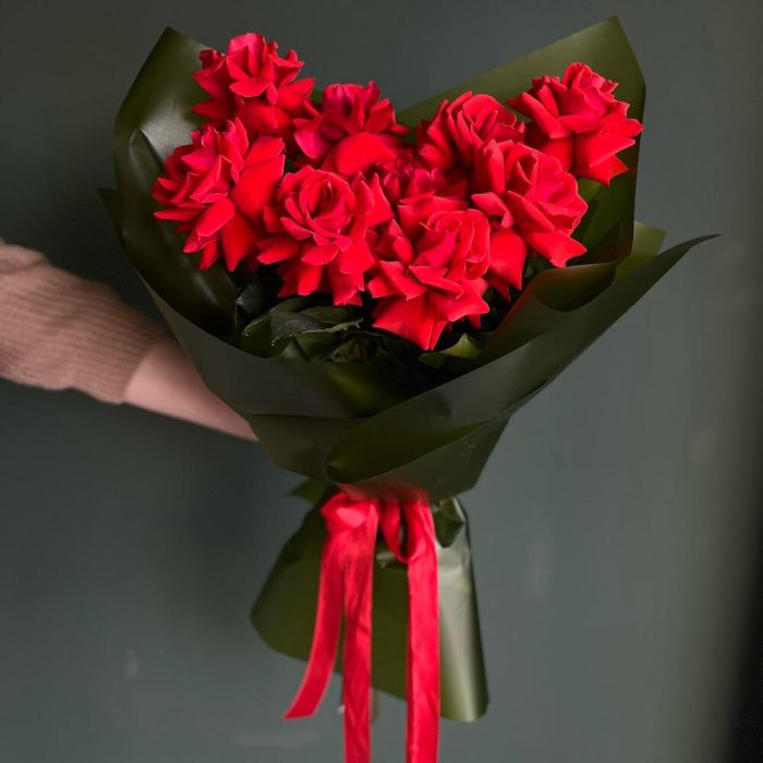 Роза красная – 9 шт.Авторская упаковка – 1 шт.уходовое средство для цветов – 1 шт.инструкция по уходу за цветами – 1 шт.Мини открытка – 1 шт.Аквабокс – 1 шт.транспортировочная упаковка – 1 шт.