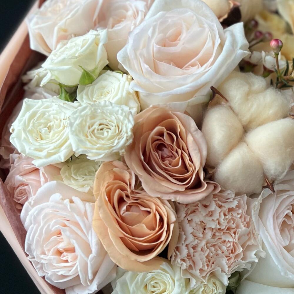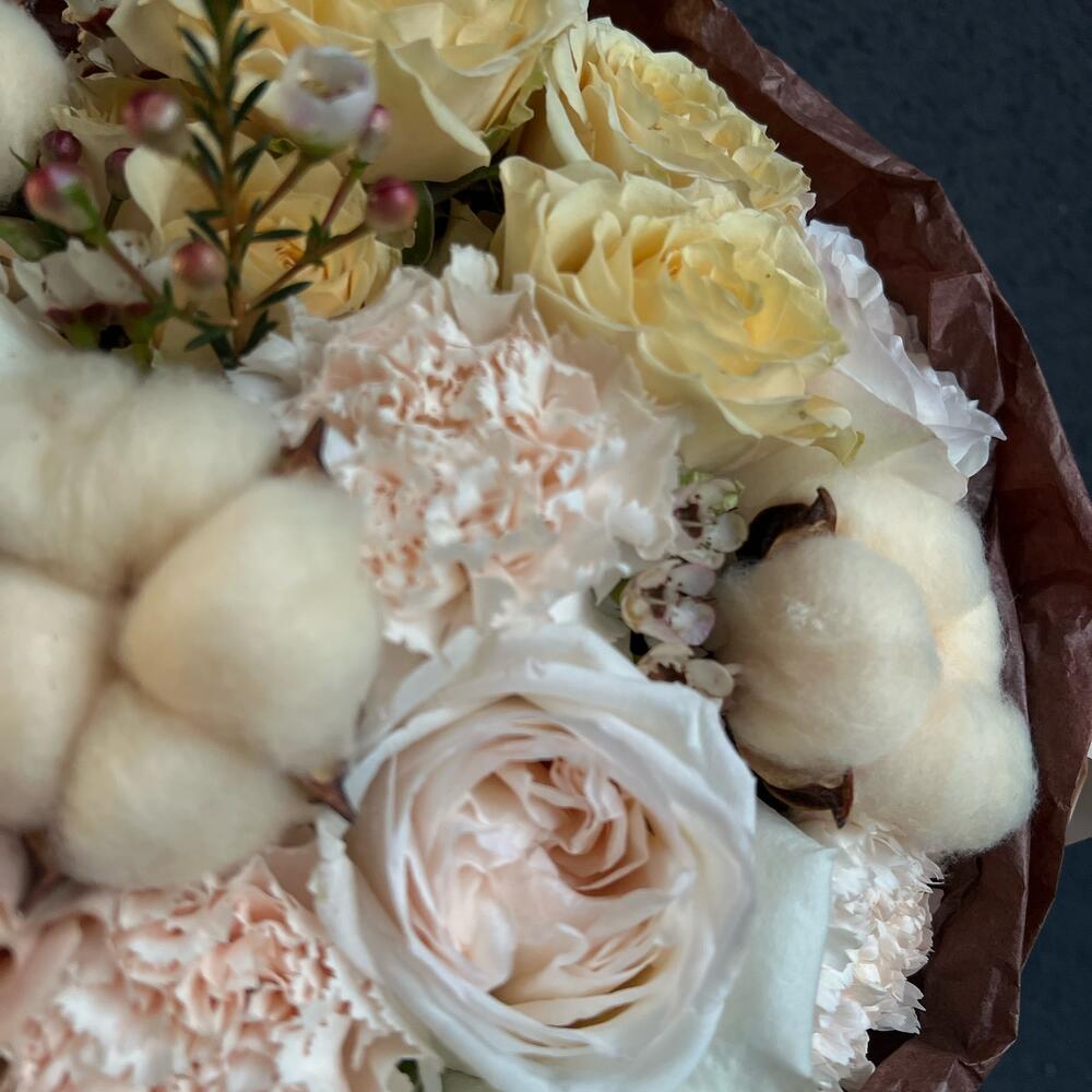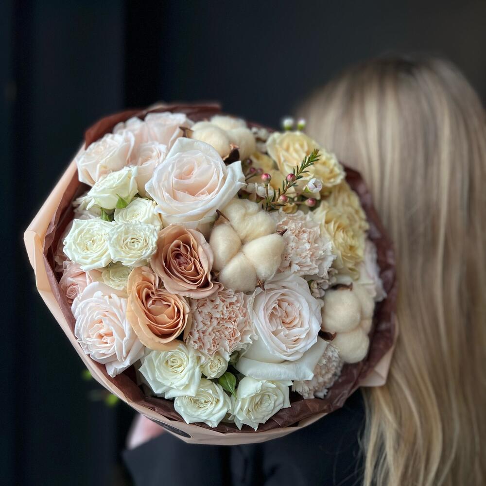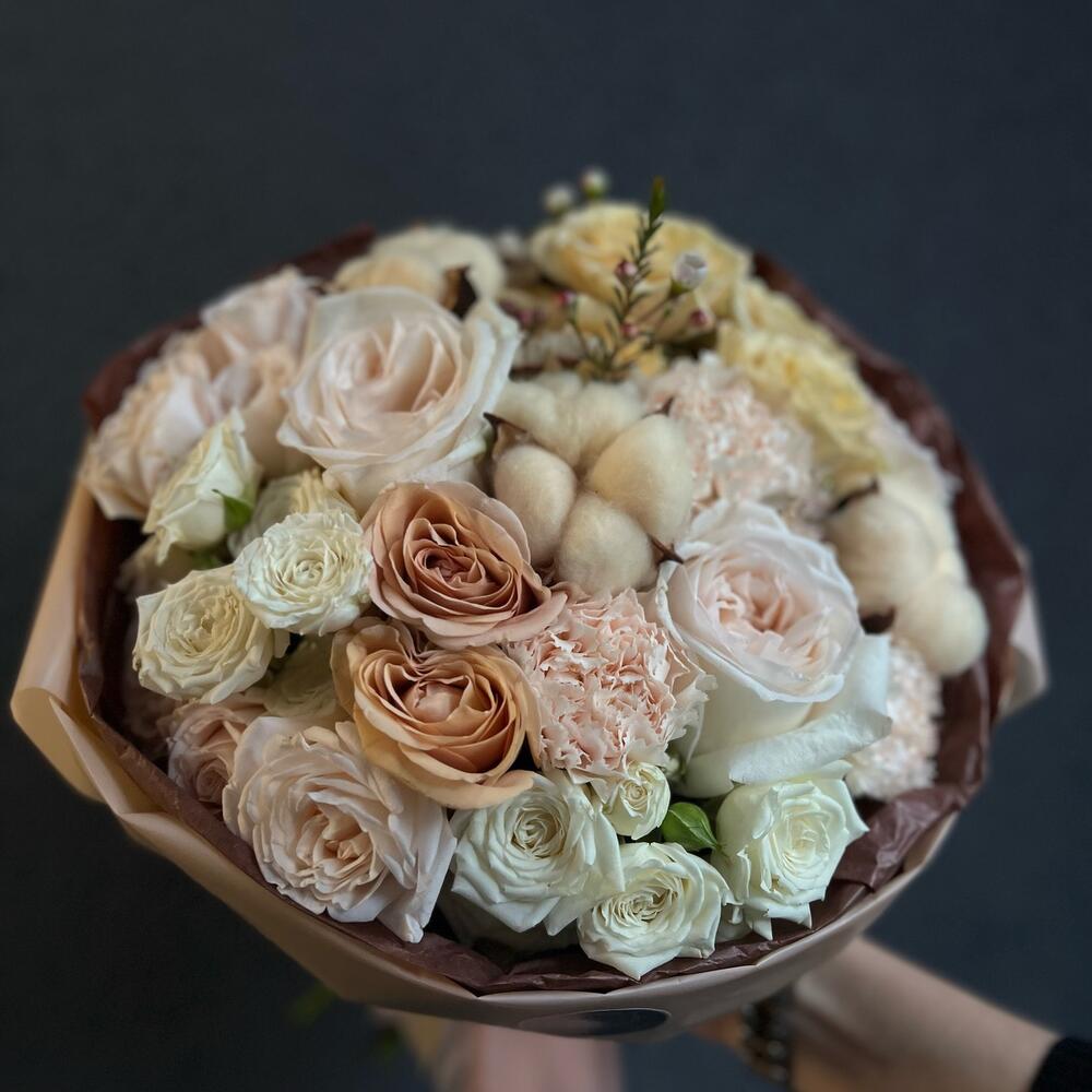 Букет из ароматных пионовидных роз и хлопка «Капуччино»