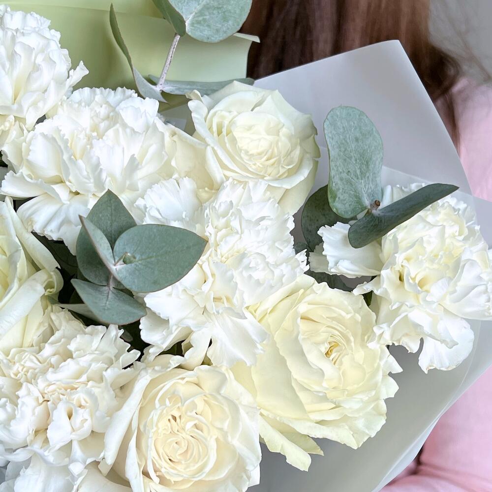 Букет из роз, эвкалипта и гвоздики