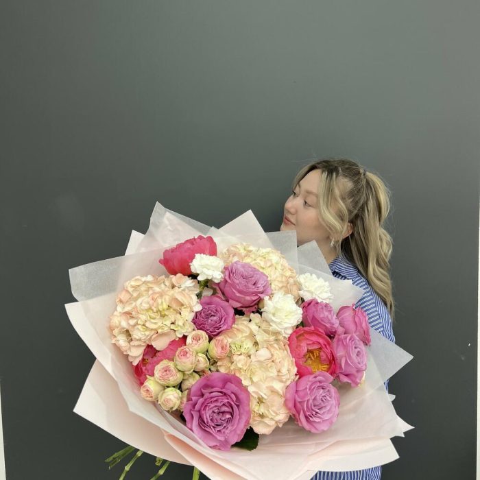 Ароматная корзина с пионами и матиоллой