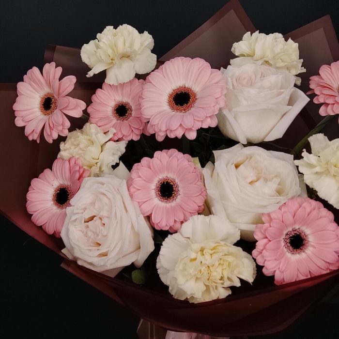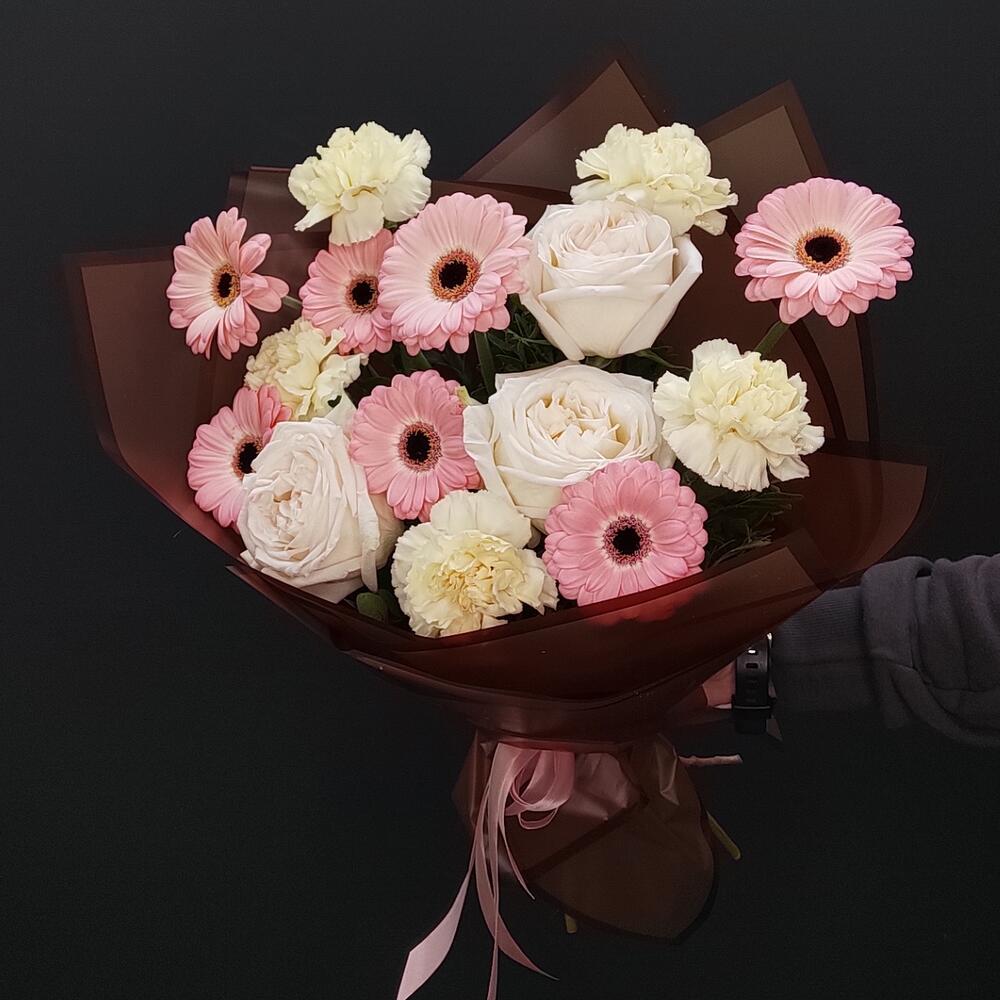 Гербера – 7 шт.Роза остина пионовидная – 3 шт.Диантус – 5 шт.Пленка матовая – 1 шт.