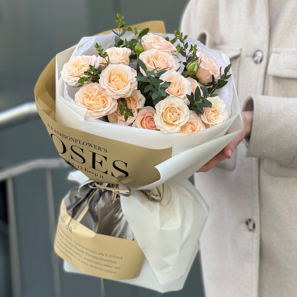 Нежный букет в стильном оформлении из кустовых роз и эвкалипта!