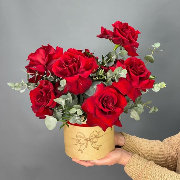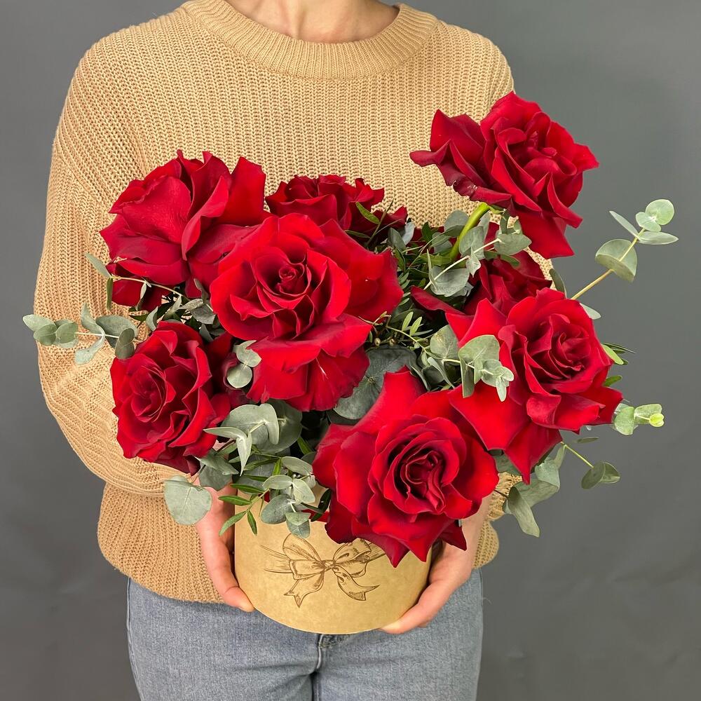 Лента – 1 шт.Эвкалипт – 2 шт.Роза одноголовая – 9 шт.Коробка шляпная – 1 шт.Фисташка – 2 шт.Оазис флористический – 1 шт.