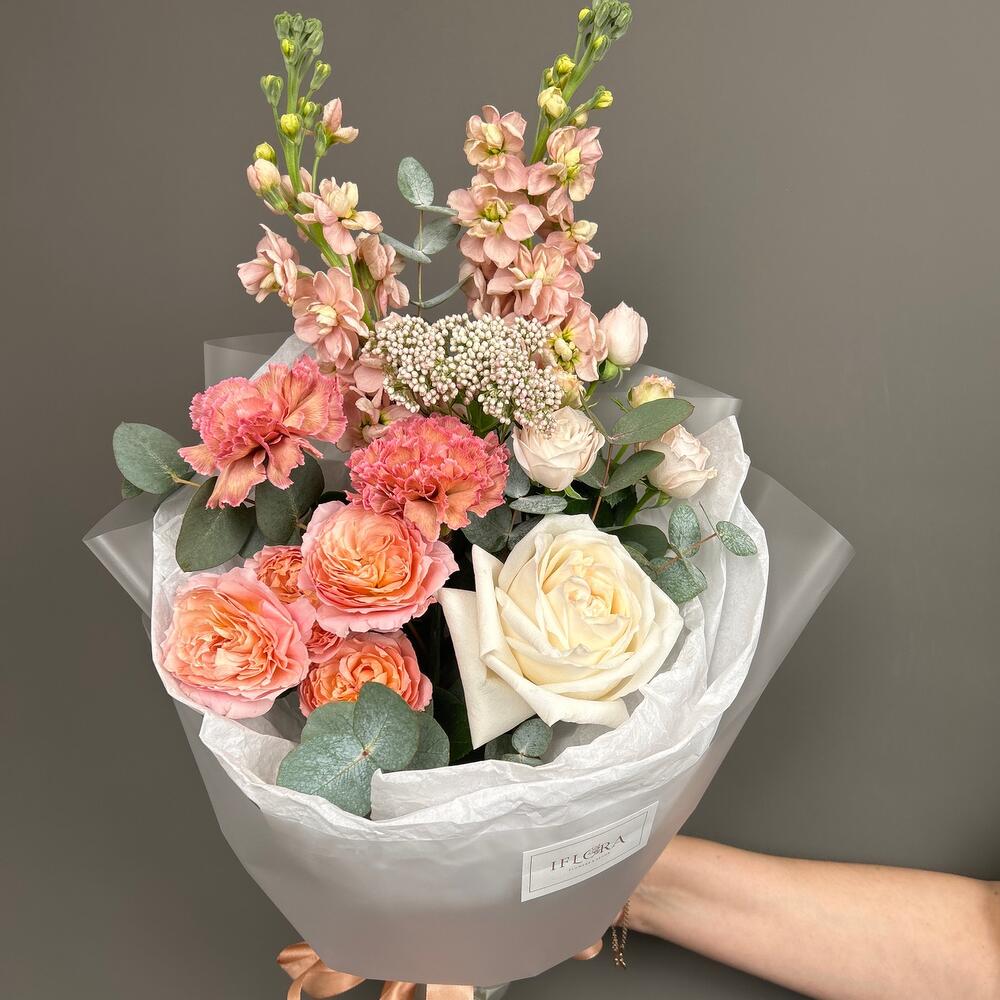 Маттиола – 2 шт.Озотамнус – 1 шт.Эвкалипт – 3 шт.Гвоздика – 2 шт.Лента атласная – 1 шт.Тишью – 1 шт.Пленка матовая – 1 шт.джульетта роза пионовидная – 1 шт.Роза мадам бомбастик – 1 шт.роза вайт о хара( ароматная) – 1 шт.