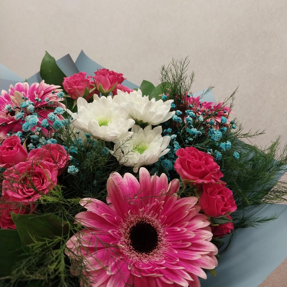 Категорий: Герберы, Гипсофила, Кустовые розы, Розы, Хризантемы