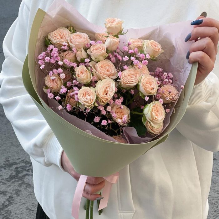 Монобукет из кустовой розы и гипсофилы «Месяц май»