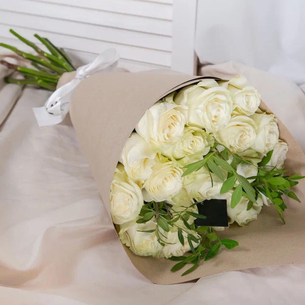 роза mondial 60 см – 19 шт.Фисташка – 2 шт.Упаковка крафт – 1 шт.Лента атласная – 1 шт.