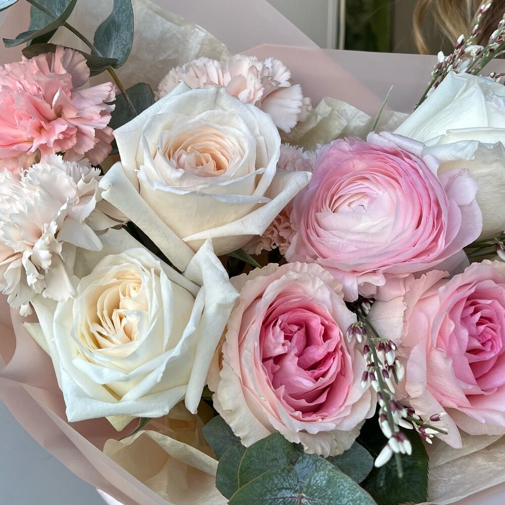 Ранункулюс – 1 шт.white o’hara роза – 3 шт.Диантус – 4 шт.Роза майра – 2 шт.гениста розовая – 2 шт.Эвкалипт Микс – 3 шт.Упаковка дизайнерская – 3 шт.Лента атласная – 1 шт.