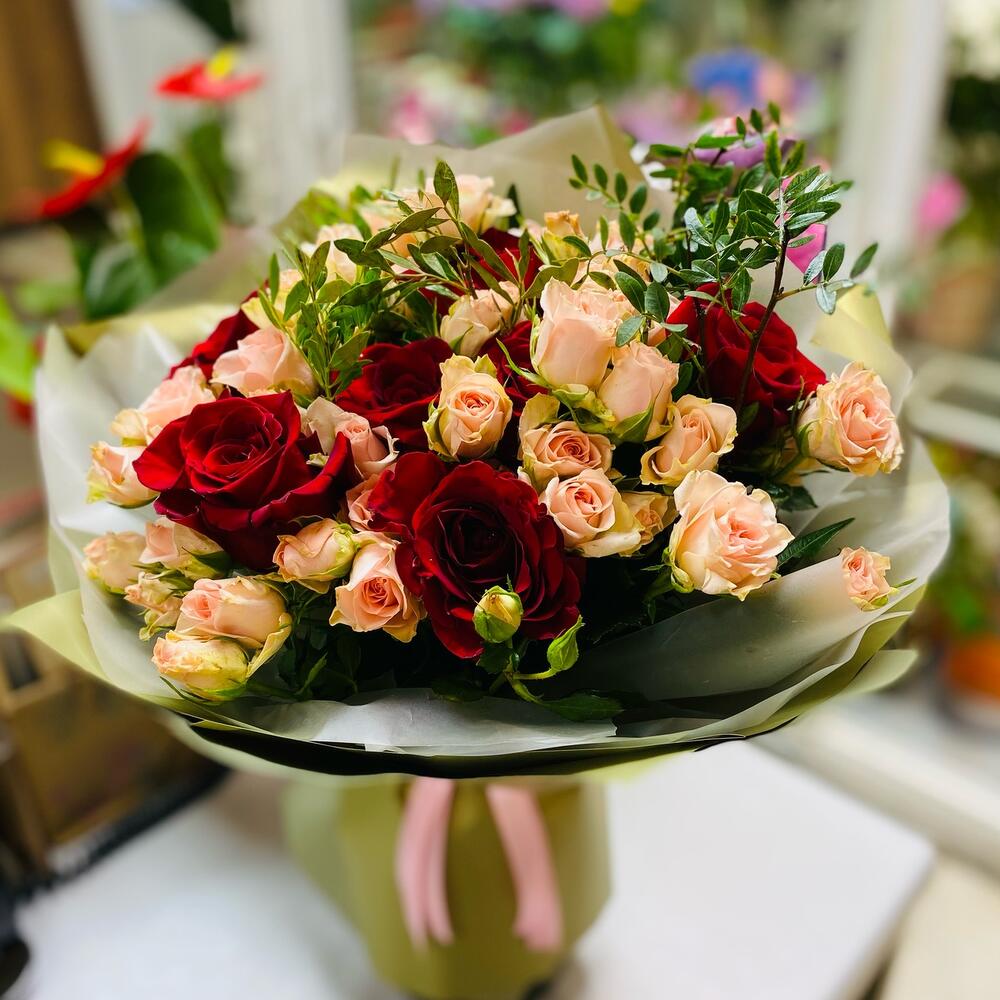 Роза – 7 шт.Роза кустовая – 10 шт.зелень декоративная – 3 шт.Упаковка дизайнерская – 2 шт.