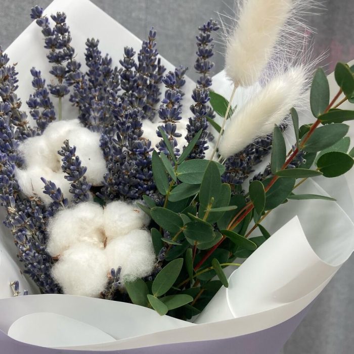 Хлопок натуральный – 3 шт.Лаванда – 1 шт.Эвкалипт – 3 шт.Упаковка дизайнерская – 1 шт.Лагурус (сухоцвет) – 3 шт.