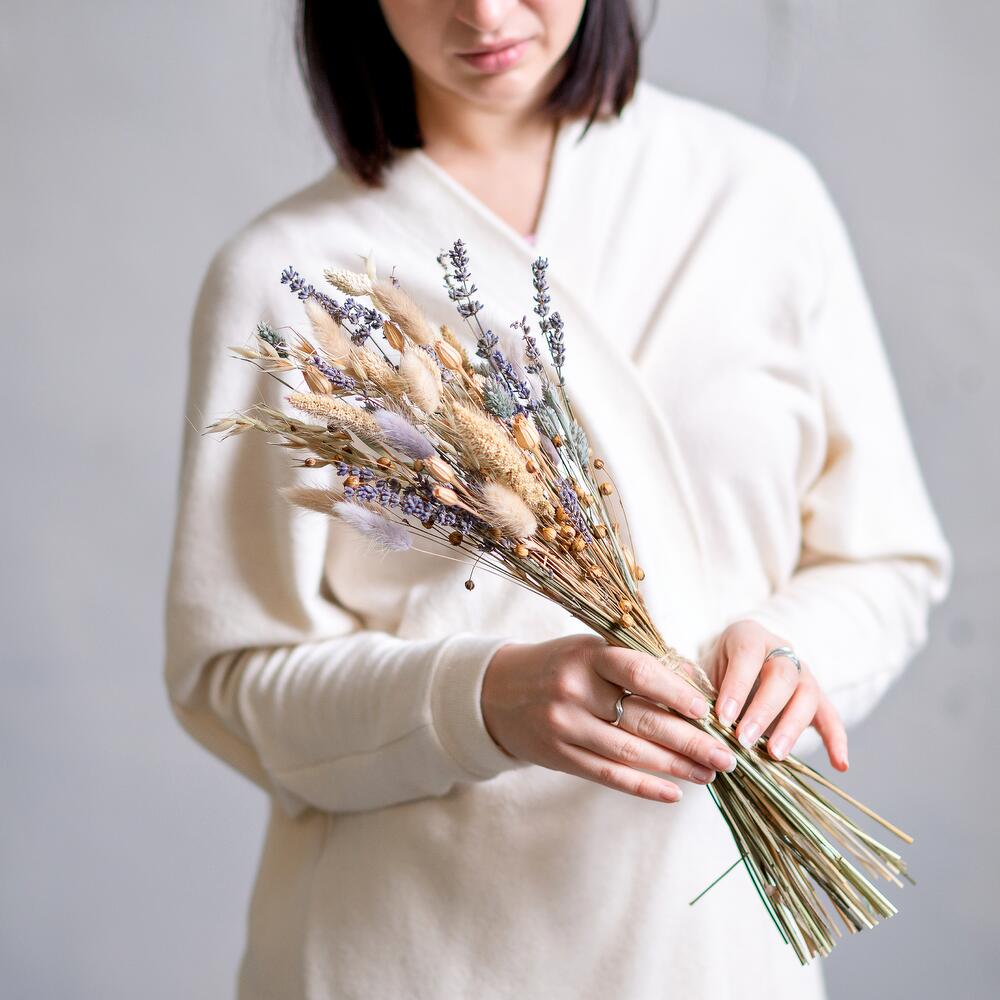 Лаванда – 3 шт.Цинерария – 1 шт.Лен – 1 шт.Лагурус – 2 шт.Сетария – 1 шт.Фаларис – 2 шт.Дизайнерская упаковка – 1 шт.дикий овес – 1 шт.